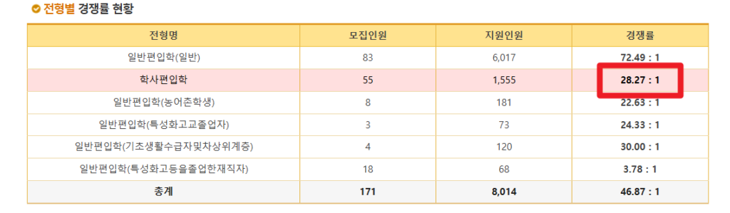 예를 들어, 동국대 25년도 모집 현황을 기준으로 보면 일반편입 평균 경쟁률 72.49 대 학사편입 평균 경쟁률 28.27로 약 50% 가까이 차이가 납니다.